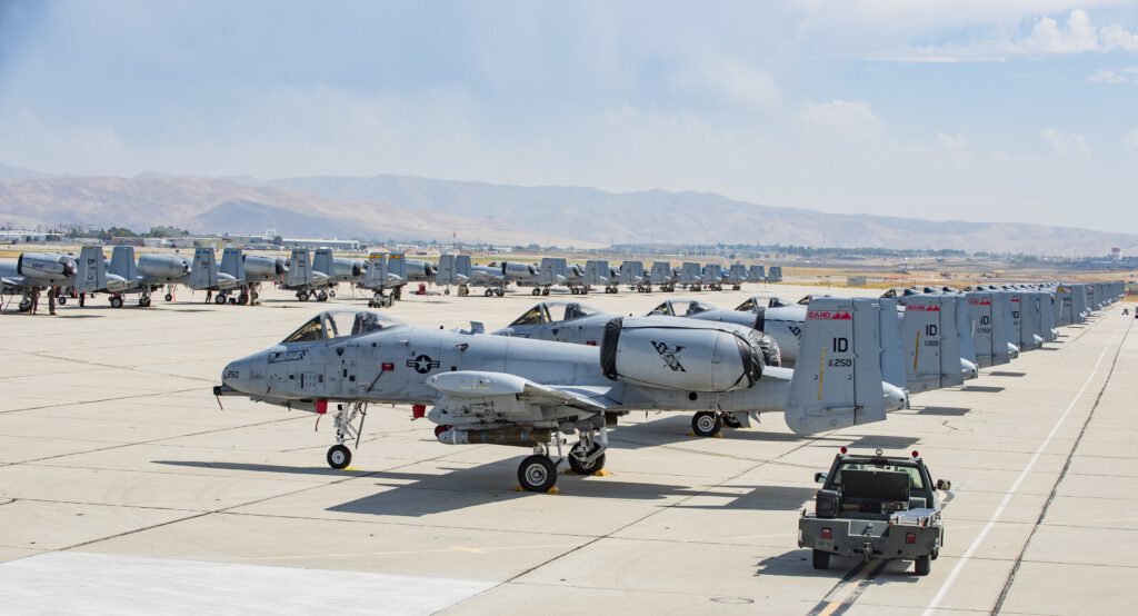 The Idaho Air National Guard’s 124th Fighter Wing is hosting biennial A-10 Thunderbolt II competition, Hawgsmoke, Sept. 6-9, 2022. On Sept. 7, nearly 30 A-10s from across the nation parked at Gowen Field’s flightline in preperation for the competition. (U.S. Air National Guard photo)