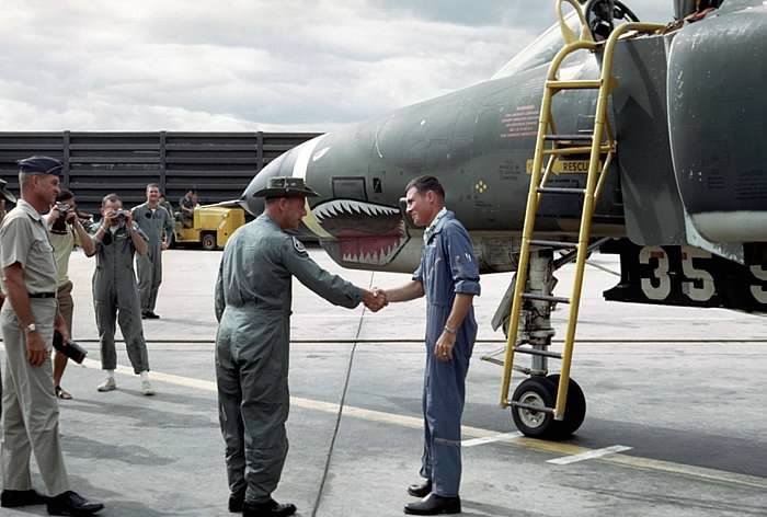 The Squadron Commander, Lt. Col. (now Col.) Edward Hillding, with surreptitious aid and abettance from sources probably (?) unknown to the Wing Vice Commander, Col. (now Brig. Gen.) Daniel Chappie James, decided to test paint a few aircraft shortly before deployment. There was an instantaneous boost in squadron morale and pride. There was no doubt as to which squadron the shark-toothed F-4Es belonged.