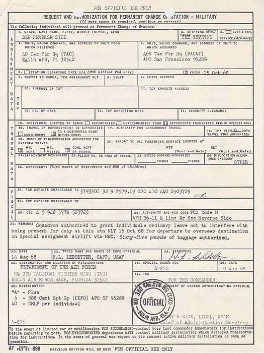 During late 1966 and into 1967, the 33rd Tactical Fighter Wing at Eglin AFB, Florida, had four squadrons of F-4D Phantoms. The 33rd had been deploying full squadrons, about 20 aircraft and 55 crew members, of F-4Ds to Southeast Asia (SEA) and then, as soon as one squadron would deploy, the squadron would be reformed and several months later after all the new personnel and aircraft were available and trained, the squadron would deploy again. In May 1967, the 40th Tactical Fighter Squadron, with a full complement of F-4Ds and crewmembers, deployed to Ubon Royal Thai Air Force Base, Thailand. As soon as that Squadron deployed the 40th was reconstituted and subsequently deployed in November, 1968, to Korat Royal Thai Air Force Base, Thailand. This is the history of that squadron.