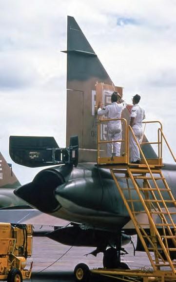 ‘Several modifications were made locally to the radar at this time to aid us in low-altitude target acquisition. These changes were later adopted across the entire F-102 fleet. Scuttlebutt around the squadron had it that we were training to shoot down North Vietnamese An-2 ‘Colt’ supply airplanes that were known to be dropping muchneeded equipment to the enemy.’ Ordnance loads carried by the Delta Daggers in the Far East were an AIM‑26B Falcon air-to-air missile in the front bay, three AIM-4C air-to-air missiles in the rear bay and 12 2.75in rockets. This combination was used at Clark, Da Nang and Tan Son Nhut. The detachment at Bangkok, however, used a slightly different set-up with three AIM-4As in the front bay and two AIM-4C/Ds plus another AIM-4A in the rear bay. The Falcon series of missiles had a speed of Mach 4 at a range of six miles and gave the F-102 a greater capacity for knocking down anything that should come up to challenge it.