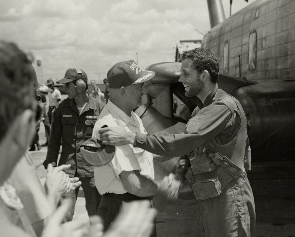 Locher’s call was picked up. Within hours, a small search-and-rescue (SAR) force was on its way from Nakhon Phanom, Thailand. After the A-1 Sandys were satisfied that they were talking to Locher, an HH-53C SuperJolly helicopter, flown by Capt. Dale Stovall, started in for the pickup, but the SAR force was driven off by missiles and MiGs. Maybe rescue was not possible so far north of the DMZ, after all.