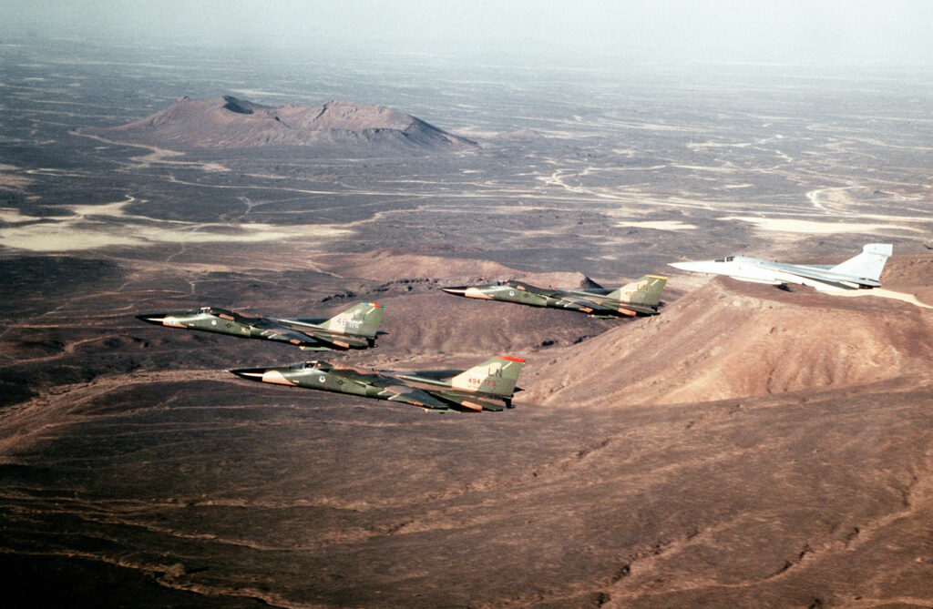 During Operation El Dorado Canyon (April 14–15, 1986), Upper Heyford launched five EF‑111As and twenty F‑111Es. The EF‑111s joined the Lakenheath F‑111Fs to provide electronic defense over Libya, while the E‑models served as airborne reserve for the strike package.