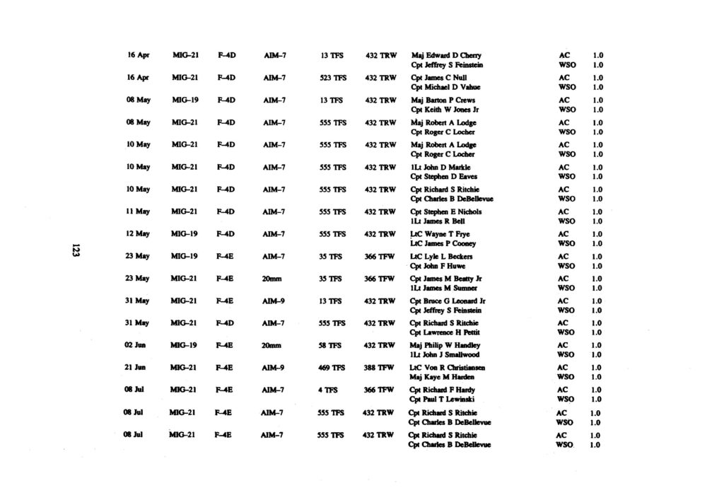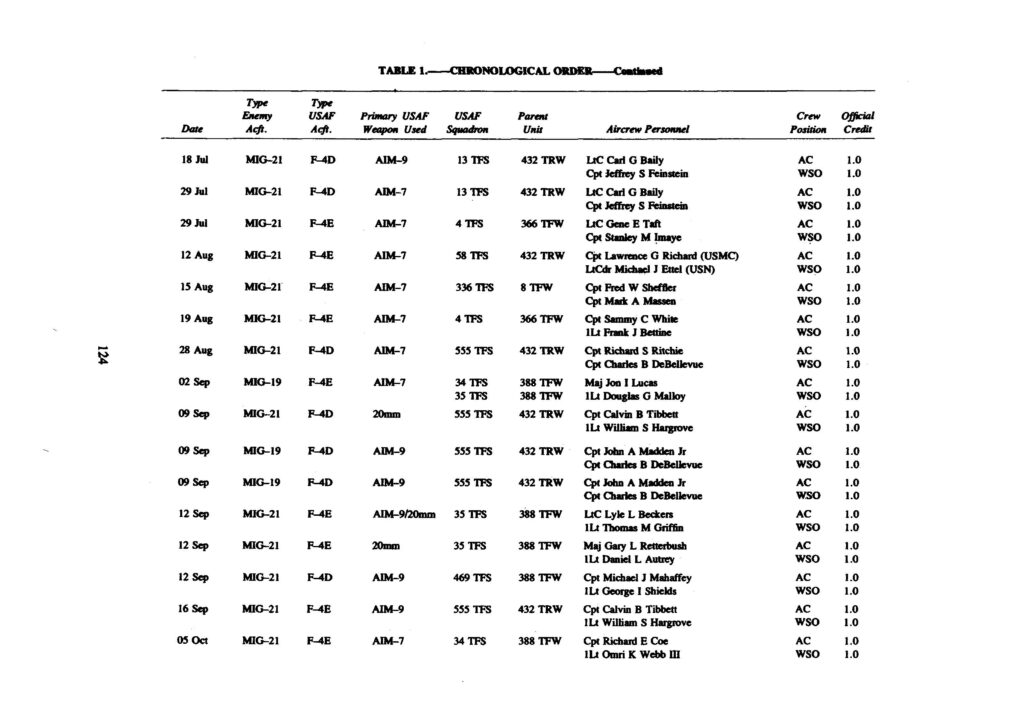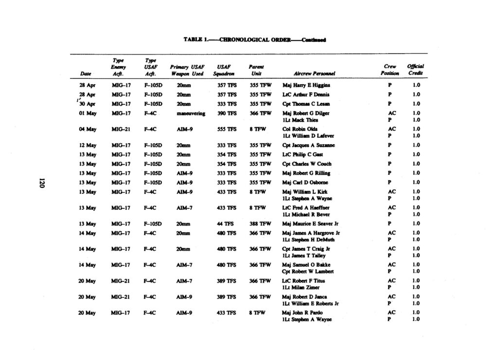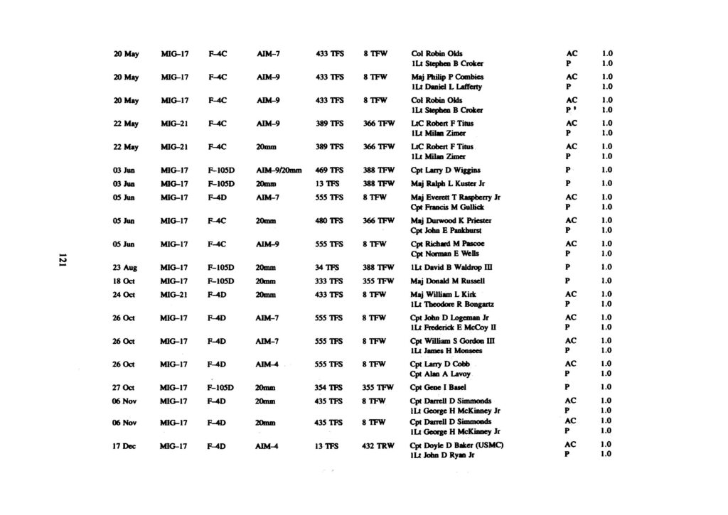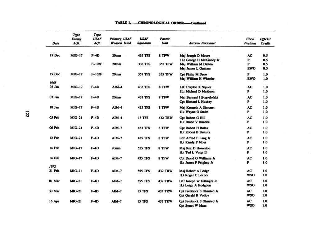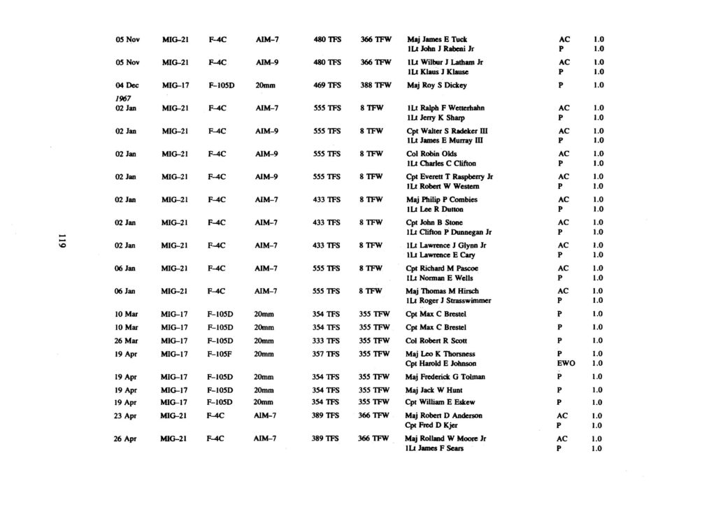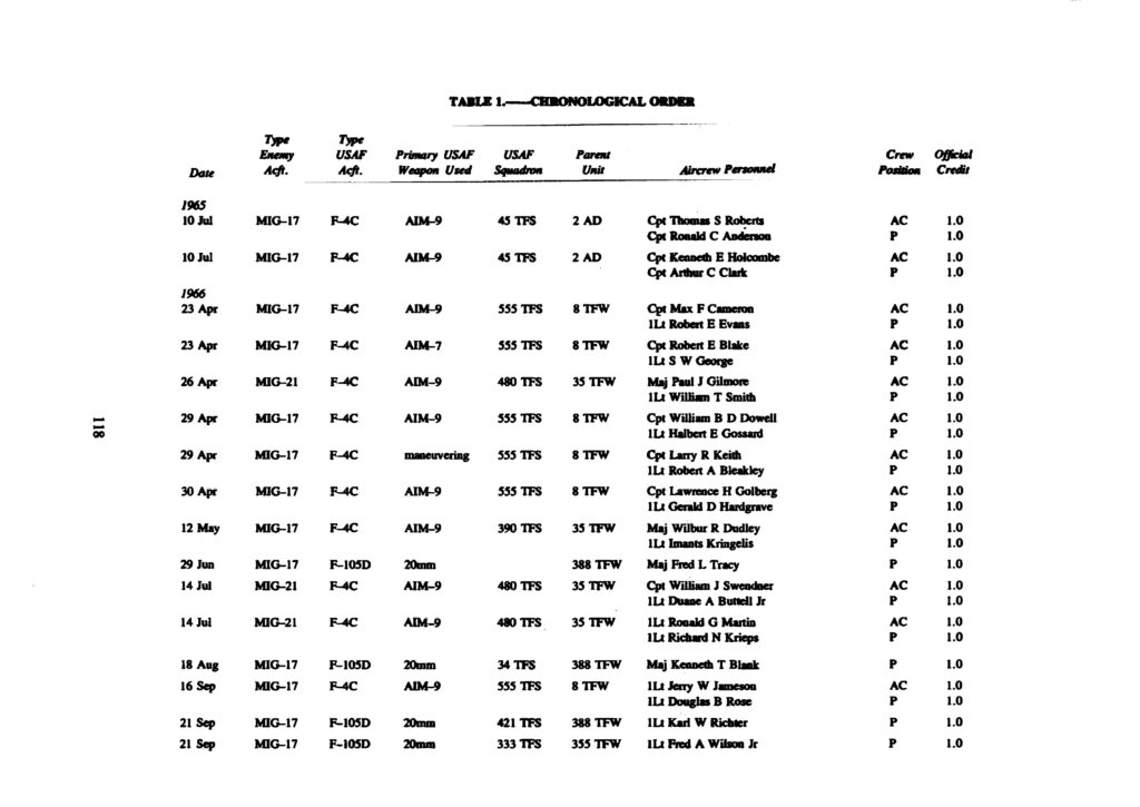 The 137 victories have been compiled and are presented below. The numerous claims for the destruction of enemy aircraft which were never confirmed are not included in the lists. The first presents all USAF aerial victories in chronological order.