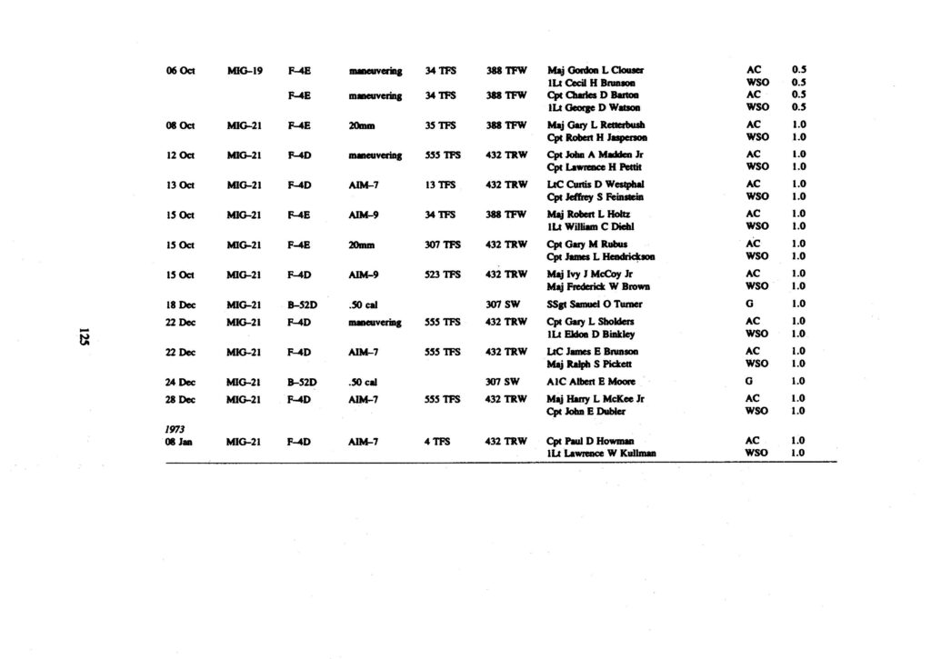 Of the confirmed total of 137 kills by USAF fliers official credit was awarded to 207 individuals. Pilots of single-place F-105D aircraft earned 25 victories; two-man aircrews of F-4D, F-4E, and F-105F aircraft earned 108. One victory credit was shared by F-105F and F4D aircrews, and one by two F-4E’s. Gunners aboard B-52D heavy bombers earned two aerial victories in the last stages of the war.