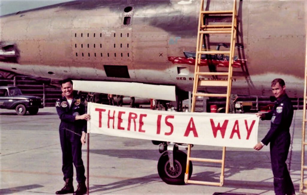 “There is a Way” (meaning to achieve 100 missions and rotate back home, instead of ending up as a POW or worse before completing 100 missions) In front of F-105F 63-8351, Pilot, Major Bob Huntley & EWO, Capt. RW Stearman, “Red River Showboat” 354th TFS.