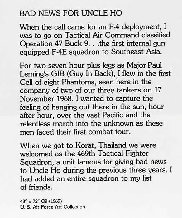 Keith and his wife, Peggy, have been very active in all of the Squadron’s activities and reunions and Keith has been able to borrow “Bad News for Uncle Ho” and “F-4 Squadron Names The 469th In Korat” from the Air Force Art Collection and bring them to a couple of our reunions.